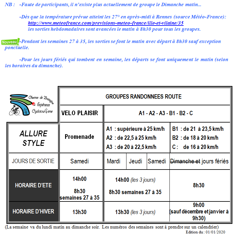 Vous pouvez nous rencontrer et rouler avec nous lors de 3 sorties (conforme aux préconisations de la ffvelo) avant d’envisager une adhésion annuelle. Départ Parc de Loisirs,  Chartres de Bretagne, les mardi, jeudi et samedi à 13h30 en hiver, ou 14h en été.